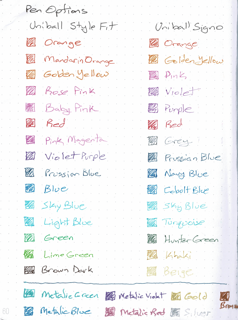 In a very close second place are the Uni-StyleFit or Uniball UM-151 colored gel pens. These have a good range of colors, use the same archival quality Signo ink and write very smooth while drying quickly. My only complaint is the yellow ink can be difficult to differentiate from orange depending on the lighting. In third place are the Zebra Sarasa Clip gel pens. These pens have archival quality ink, in some cases more vibrant colors than the Uniball but they don’t write as smoothly, especially smaller tips, nor do they dry as fast. The Uni-StyleFit and Zebra Sarasa also have multi-pen options and their refills fit each others multi-pens. Multipens are a great option for travel.