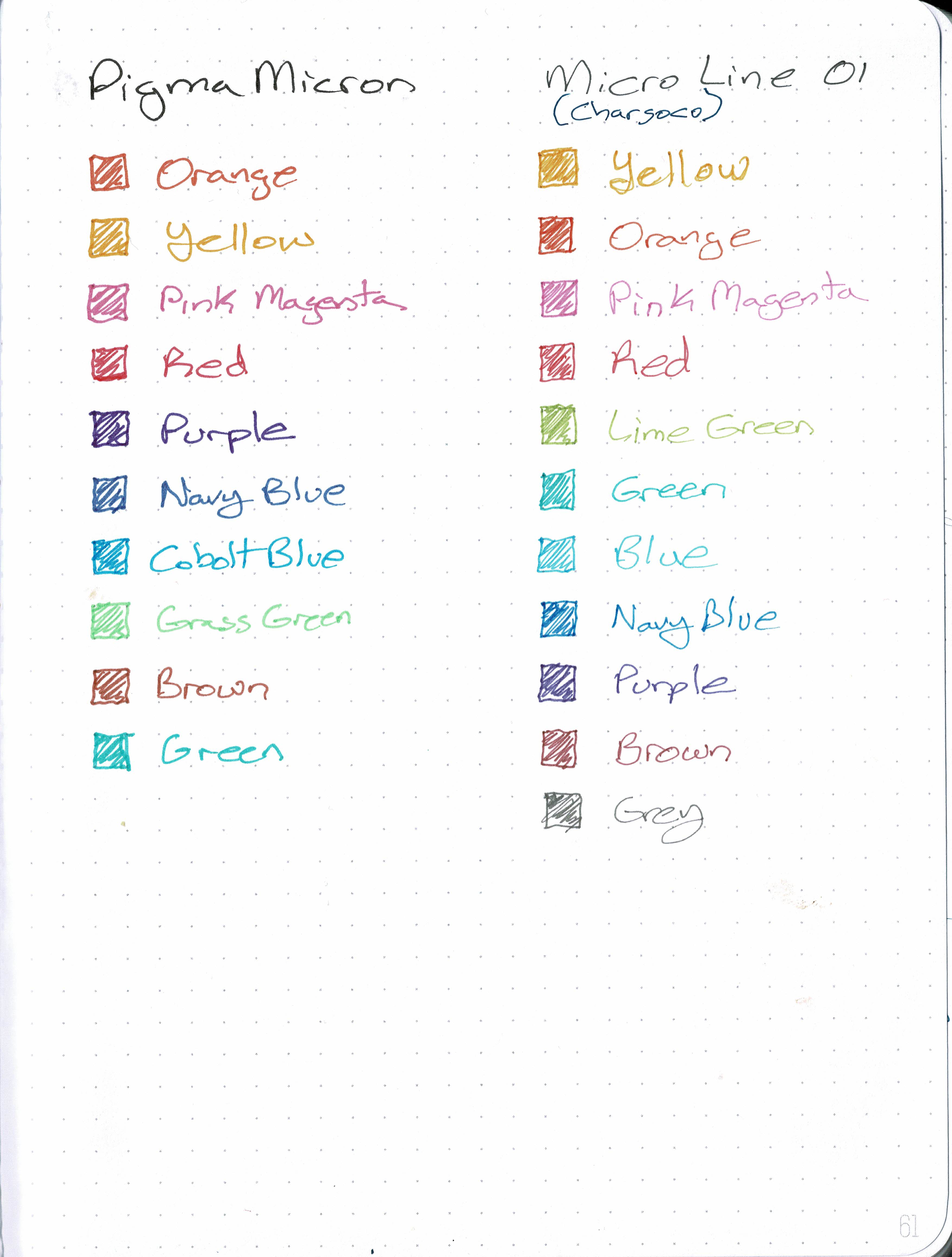 In this category of pin tip plastic nib pens the first place must go to the Sakura Pigma Micron pens. As far as quality of ink and vibrancy while successfully preventing bleeding through many types of papers, they may bleed a little if you rest the tip in one spot or go over the same line multiple times. Many artists swear by Pigma Micron pens. However the Inductive set with 05 nib size is a bit large resulting in thick strokes so I would recommend the 01 size. The Signo UM-151 only beats out the Pigma Micron with its number of colours. Finally in second and third place are the the lower cost alternative Charsoco Micro Pens and Zebra Sarasa Bible Liners . I have recenlty tried out the Charsoco pens and they work just as well as the Pigma Micron having archvial ink and are a good low cost alternative to the Pigma Micron pens.