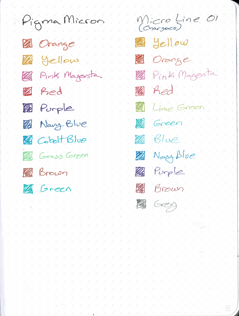 So out of all these choices which pens would I recommend? I choose for first place the Pigma Micron pens which are a microline technical pen. I would use the smaller 01 (0.25mm) size tips. These can be more costly but they tend to be more vibrant than gel pens. For a more affordable option that has archival quality the Charsoco Micro Pens are a good liner option (these are white label pens that can be found under other labels such as Shuttle Art). I recently purchased a set and I’d have to say they match the Pigma Micron color and quality so I might recommend these over the Pigma Micron just for the fact that they cost half the price while matching remarkably close to the quality.